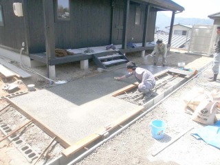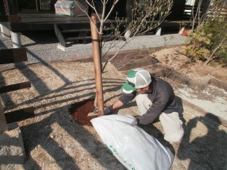 | 取り付け作業により塗料が剥がれたところを、再度塗装しているところです。 | 植栽にマルチングを施していきます。マルチングの目的は、土壌の乾きを抑えるためと、見た目をよくするためです。今回はホームパーティーのことがありましたので、見た目向上が目的です。 | |