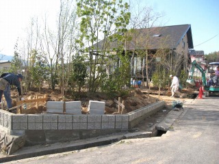 | 洗い出しを行っています。砂利を表層に埋め込み、モルタルが固まる前に水で洗い流して、埋め込んだ砂利の表面を露出させます。 | ブロックが積み上がりました。これで土壌の流出を考えずに土壌を入れることができます。高木植栽も完了しています。 | |