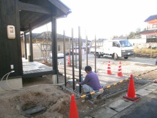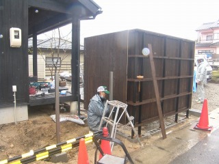 | パーテーションの柱を立てています。重いパーテーションになるため、強度を出すために柱の数が多いです。 | 両側に板を取り付けていきます。杉板に防腐剤を塗布しているのですが、この塗装にはいつも時間がかかります。特に冬場は塗装が乾かずに待ち時間まで必要となります。 | |