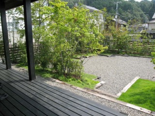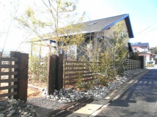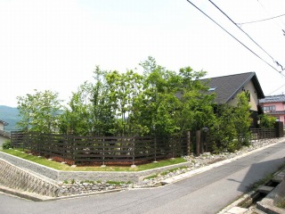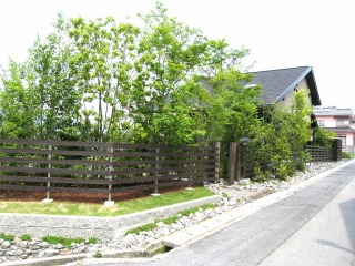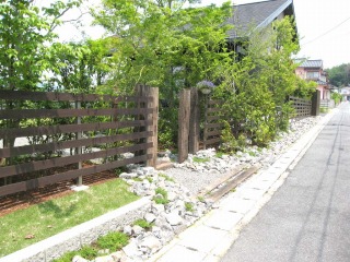 角地の2区画ですので、造園的に修景すべき面積、長さが、非常に大きかったです。そのため予算を抑えつつ、見栄えの良い方法を考えるのが、大変でした。 見た目の美しい新築住宅でしたので、その美しさを損なわず、相乗効果を発揮する景観を意識しました。ウッドフェンスの色と住宅の色が、とても良く似合っていると思います。 |