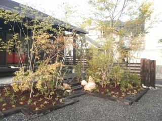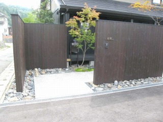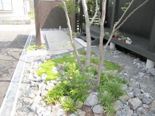 | 玄関へのパーテーションです。色合いのせいか、考えていたよりも重厚感がでました。足元には雑石を敷き詰めています。 | 玄関横の植栽です。ノムラモミジを植えています。足元にはグランドカバーを配しています。 | |