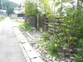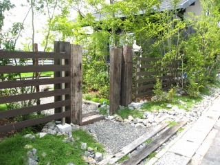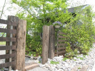 | 枕木を立て、庭への門としました。門の周囲は、雑石とグランドカバーで修景しました。 | ||