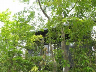 | 枕木でつくった階段です。枕木は重量が比較的軽く、加工が容易なため、とても使いやすい素材となります。ただし、全国的に枕木のコンクリート化が進み、昨今では入手が困難になってきています。 | 見る角度によっては、うっそうと茂った林の中にある住宅となります。ここまで緑が濃かったら、外から室内は見通せませんね。 | |