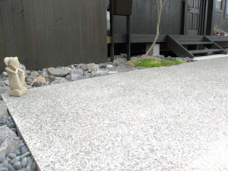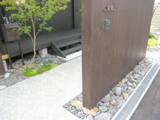 | パーテーションには、表札とインターホンを取り付けています。右に左に90度づつ2回曲がると、玄関にたどり着くことができます。 | 少し判りにくいですが、コンクリートの打ちっぱなしではなく、洗い出しとなっています。洗い出しとはコンクリートの表面に砂利を浮き出させる、造園技法です。 | |