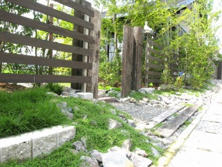| 道路に面している延長が長いため、造園的に修景すべき部分が非常に多い敷地でした。 | 雑石とグランドカバーを利用して、自然度の高さを醸しだしています。枕木の古びた感じも、雰囲気づくりに貢献しています。 | |