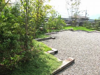 | 植栽地を枕木で仕切り、その内側は砂利を敷いています。舗装素材で最も経済的なのは砂利敷きとなります。 | 枕木の長さを色々と変化させ、直線ながら変化に富んだ景色にしています。 | |