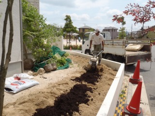 | 塀を立ち上げ真砂土を投入しているところです。容量1m3の袋に入れクレーンで吊り込みます。 | 土壌改良を行っています。改良材を敷き広げ、耕運機で攪拌しています。作業スペースが広い場合のみ耕運機が利用できます。 | |