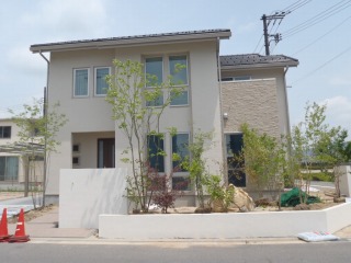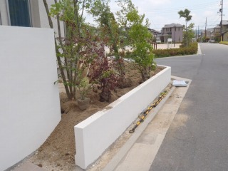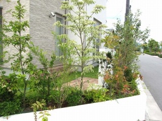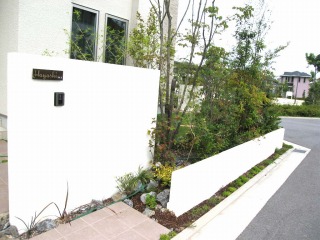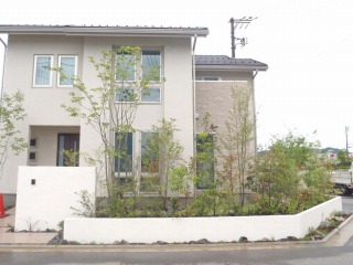 | 新築住宅の外構および造園工事を実施しました。山採り樹木を利用して、サラッとした雰囲気に仕上げました。塀をセットバックさせ、空いたスペースに植栽を施すことにより、緑が重層的に重なり深みのある景観が形成されます。 角地にあたるため、宅地の2辺が緑に囲まれた形となっており、これから植物が生長することで、雰囲気のある住宅になっていくと思います。 あわせてカーポートの取り付けも実施させて頂きましたが、一体で作業させてもらうことにより、カーポート専門工事業者より安価に施工できたのではないかと思います。 |