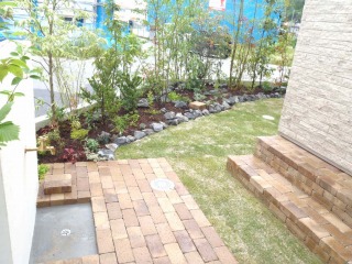 | 内側は雑石で仕切り、コウライシバを貼っています。芝を貼るときには、しっかりと土壌改良を行いますので、ふかふかの地面となります。 | 壁を立ち上げて、立水栓を設けております。足元にはレンガを敷き詰めました。 | |
