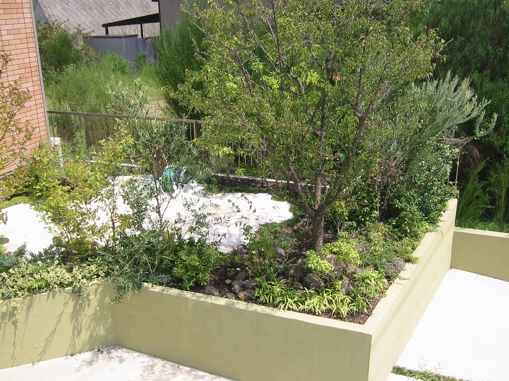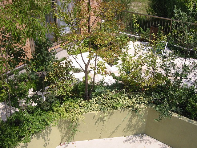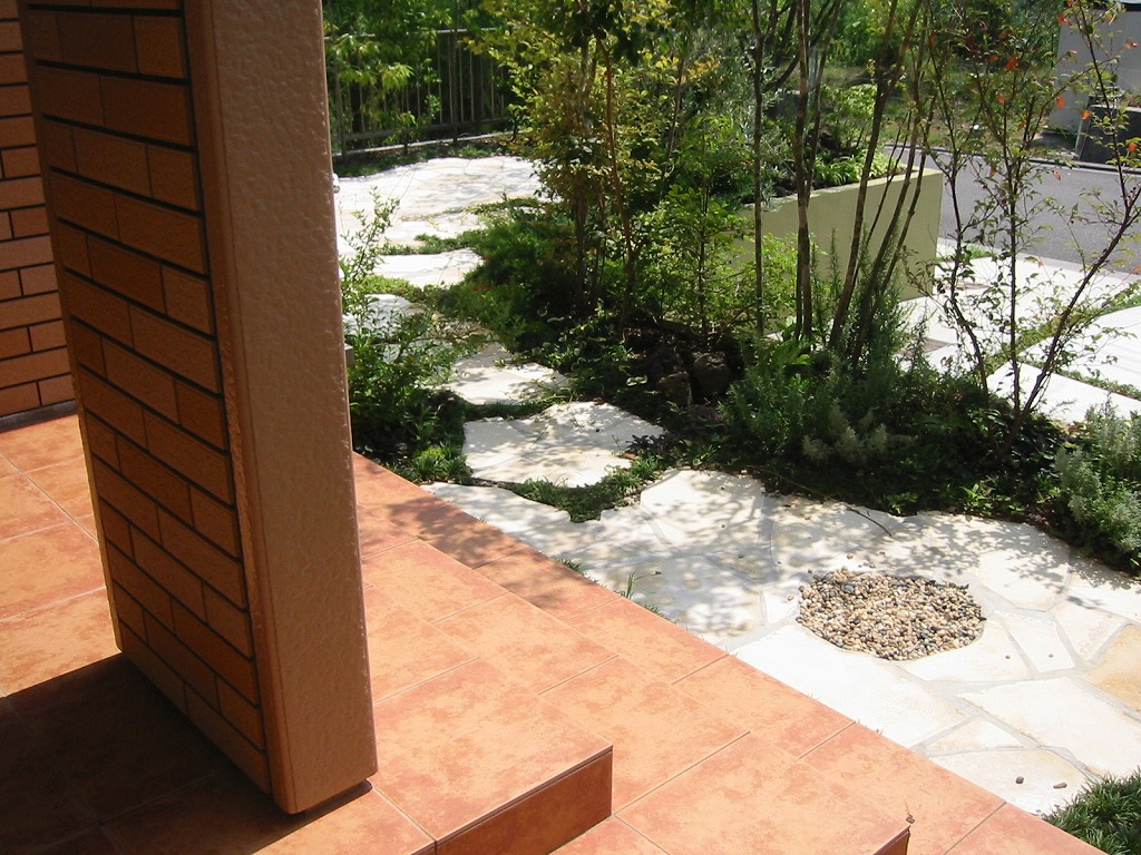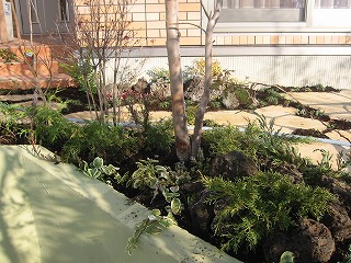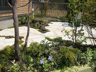 | 日差しを受けた植物たちはその姿を、クリーム色の塀と、石畳の庭に影を落とします。そのコントラストはまるで切絵のようです。将来はツタ類が垂れ下がり、コンクリートの無機質感をやわらげます。 | ストーンテラス風の石畳の脇にできた空間に、色々な山野草を植栽しました。小ぶりな火山岩を配置して、平坦にならないようアンジュレーションを出しています。 | |