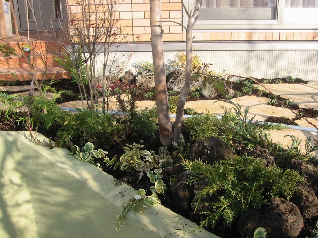 | さまざまな色が混ざるように、バラエティ豊かな植栽を施しました。下草と火山岩を組み合わせて、変化にとんだ景色を目指しています。 | ||