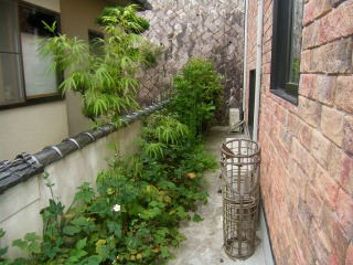 | 景色に変化をもたせるため、角部分のタイルを取り去りました。取り去った後の空間には、地被植物を植え込みました。 | 地被植物を植え込んでいます。大きくなっていたキンモクセイを強く剪定し不恰好になっていますが、2年も経てば適正な樹形になってくれます。 | |