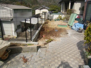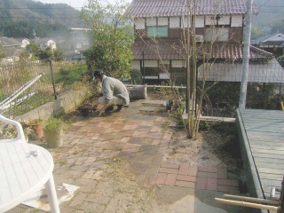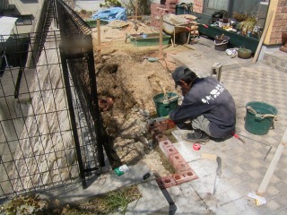 | 花壇を設けるために不要なものを撤去した状態です。 | レンガ積みの根入れ部分を作業しています。モルタルで固めながら、高さを調整していきます。 | |