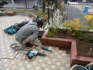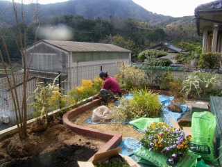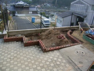 | ここまでできれば後は積上げていくだけです。強度を得るために穴あきのレンガを使い、中に鉄筋を差し込んでいます。 | 完成した花壇に植物を植え込んでいます。また将来的に植物を追加されることも考え、十分に改良した土壌を客土しました。 | |