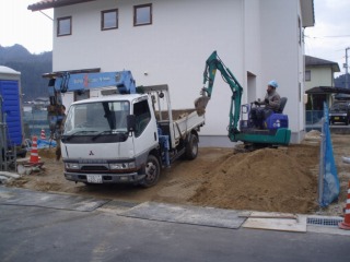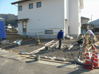 | 高さを整えるため、不要な土を取り出しています。 | 駐車場の基礎として、砕石を敷き均しています。 | |