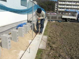 | 表面を整えていたら雨が降ってきました。仕方ないのでブルーシートで屋根を作り、その下で作業しています。 | コンクリートブロック積むために、鉄筋を差し込んでいます。 | |