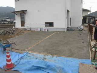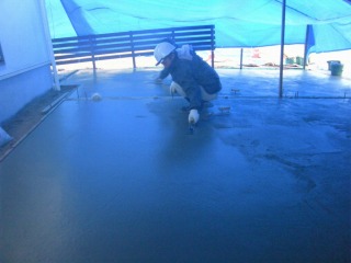 | コンクリートを打設する準備が整ったところです。コンクリートが流れ出さないように、木で作った型枠を組んでいます。 | コンクリートを打設したところです。固まるまでに表面を整えていきます。 | |