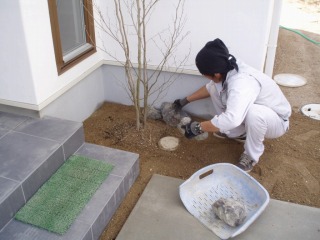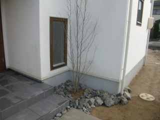 | 玄関前にシャラノキを植えました。根締めに石を配しています。 |
