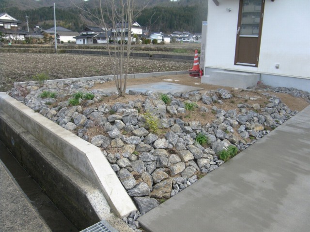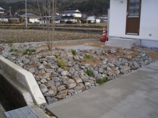 | 自然環境豊かな地域の住宅です。人口密集地ではないので、オープンな外構としました。 お庭部分には、ガラガラッと石を積み重ね、ロックガーデン風のお庭に整備しました。 まだ少し寂しいですが、これから植物が育てば彩りゆたかな空間になるはずです。 |