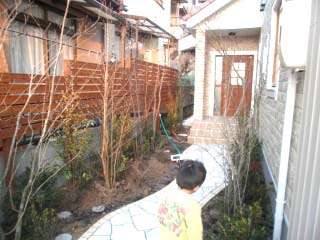 | 写りが悪いのですが、木立と言えるほど植栽を施しています。本当は常緑樹の高木も加えたいところですが、日照不足で枯損する可能性が高いと思われます。 | ||